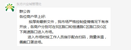 据了解,由于东莞疫情的缓解,原定封区至21日的东方兴业城已经提前恢复营业。目前市场已可有序开展进出货业务。