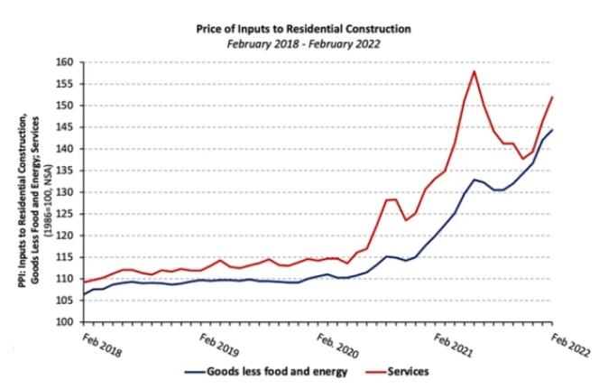 NAHB基于联邦劳工统计局(BLS)2022年2月的研究得出结论:建筑材料价格同比上涨20.4%,自2020年1月以来已上涨31.3%。